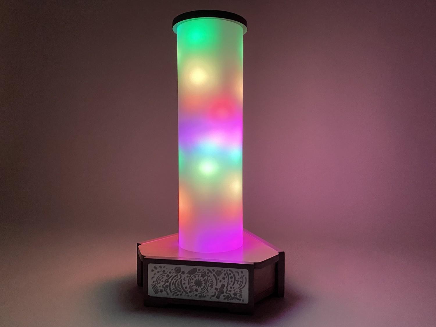 «Лампус» состоит из жёсткого основания, куда прячется блок питания и контроллер, и матового акрилового цилиндра, который и является светящейся поверхностью. Основание колонны изготовлено из берёзовой фанеры в сочетании с мдф, покрытым эмалью и жаропрочным лаком Renner на водной основе. Лак защищает изделие от загрязнения и истирания. Вставки изготовлены из безопасного акрилового зеркала с гравировкой.